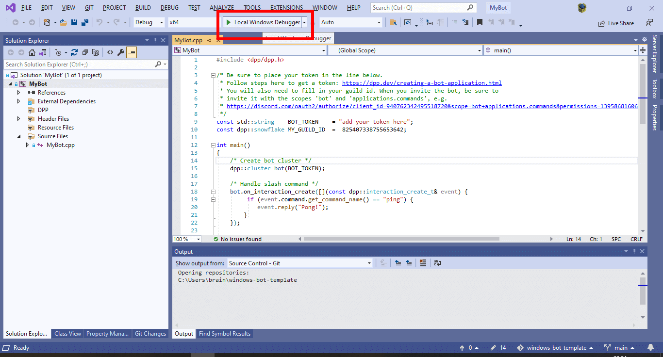 5. Click "Local Windows debugger" to compile and run your bot!