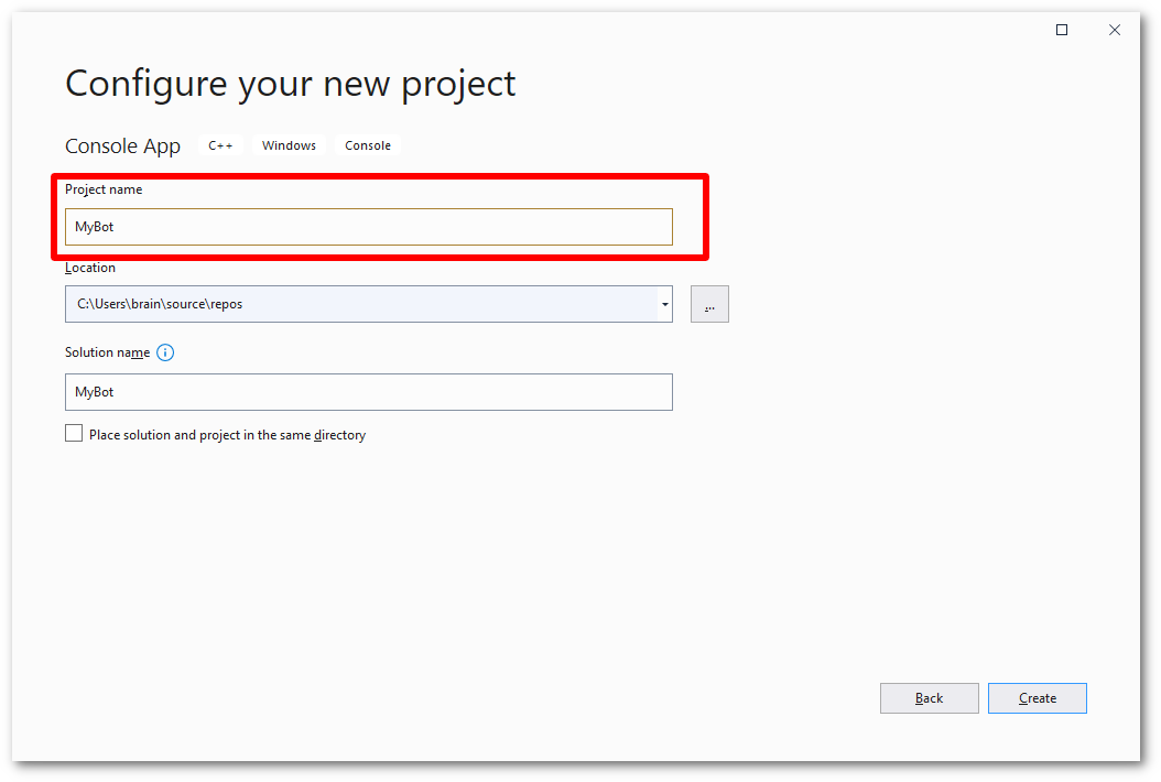 4. Name your bot project. In this example, we'll use the name 'MyBot'. You can have any name you like here.