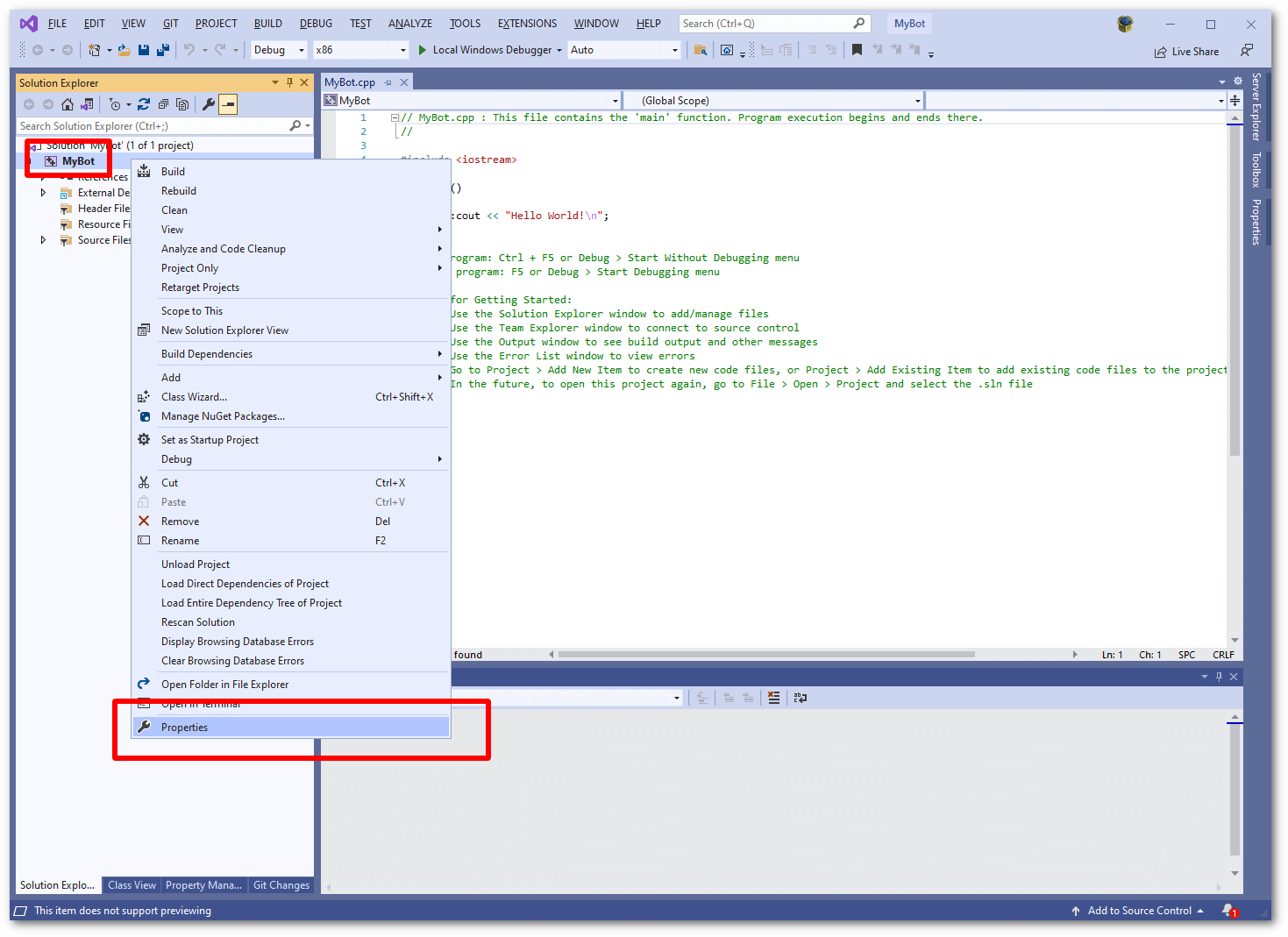 13. Now you can paste some code into the editor, completely replacing the 'hello world' application that Visual Studio made for you. The example code here is the basic bot from the first example on this site. You should at this point also double check that the architecture you have selected (in this case x86) matches the version of the dll/lib files you downloaded from the website. This is important as if you mismatch them the compilation will just fail.
