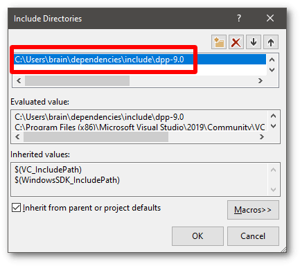 8. Click 'edit' when prompted to edit the include paths section. Add the path to the include folder you extracted to your machine, which we took note of earlier. Note that it is important to add the dpp-10.0 folder, not any other folder, to this list: