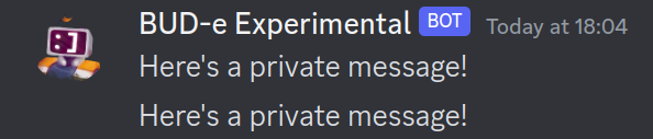 #include <dpp/dpp.h> int main() { /* Create the bot */ dpp::cluster bot("token"); bot.on_log(dpp::utility::cout_logger()); /* The event is fired when someone issues your commands */ bot.on_slashcommand([&bot](const dpp::slashcommand_t & event) { /* Check which command they ran */ if (event.command.get_command_name() == "pm") { dpp::snowflake user; /* If there was no specified user, we set the "user" variable to the command author (issuing user). */ if (event.get_parameter("user").index() == 0) { user = event.command.get_issuing_user().id; } else { /* Otherwise, we set it to the specified user! */ user = std::get<dpp::snowflake>(event.get_parameter("user")); } /* Send a message to the user set above. */ bot.direct_message_create(user, dpp::message("Here's a private message!"), [event, user](const dpp::confirmation_callback_t& callback){ /* If the callback errors, we want to send a message telling the author that something went wrong. */ if (callback.is_error()) { /* Here, we want the error message to be different if the user we're trying to send a message to is the command author. */ if (user == event.command.get_issuing_user().id) { event.reply(dpp::message("I couldn't send you a message.").set_flags(dpp::m_ephemeral)); } else { event.reply(dpp::message("I couldn't send a message to that user. Please check that is a valid user!").set_flags(dpp::m_ephemeral)); } return; } /* We do the same here, so the message is different if it's to the command author or if it's to a specified user. */ if (user == event.command.get_issuing_user().id) { event.reply(dpp::message("I've sent you a private message.").set_flags(dpp::m_ephemeral)); } else { event.reply(dpp::message("I've sent a message to that user.").set_flags(dpp::m_ephemeral)); } }); } }); bot.on_ready([&bot](const dpp::ready_t& event) { if (dpp::run_once<struct register_bot_commands>()) { /* Register the command */ dpp::slashcommand command("pm", "Send a private message.", bot.me.id); /* Add the option for a user mention that isn't required */ command.add_option(dpp::command_option(dpp::co_mentionable, "user", "The user to message", false)); /* Register the command */ bot.global_command_create(command); } }); bot.start(dpp::st_wait); return 0; }